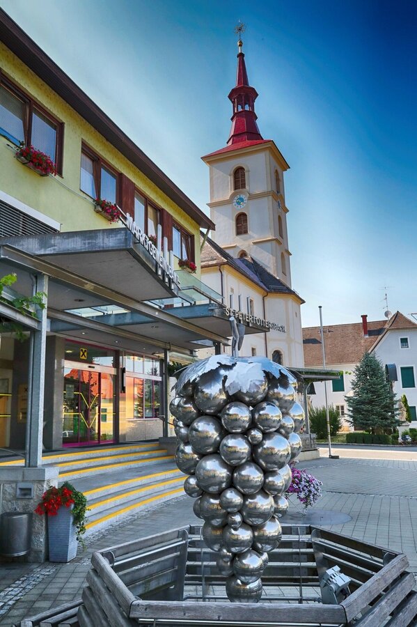 We now reach a section for connoisseurs. We hike along the hill with few ascents and can let our eyes wander through a veritable buffet of pictures. At the Calvary Church in St. Peter am Ottersbach we then turn right and descend the somewhat steep path by the Way of the Cross into the village of St. Peter. On our descent we pass the recreational area and reach the village, which we leave again at the Dorfwirt Dunkl. Now we "climb" the last hill of the umbilical cord, the Rosenberg. At the Rosenberg, Sepp's Berglermühle awaits us with a Buschenschank, the Ploder-Rosenberg winery or the Rosarium a wonderfully landscaped rose garden. Here we can rest comfortably in the shade.