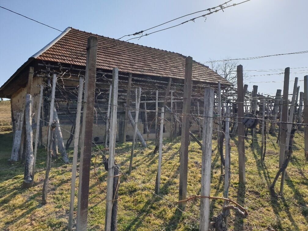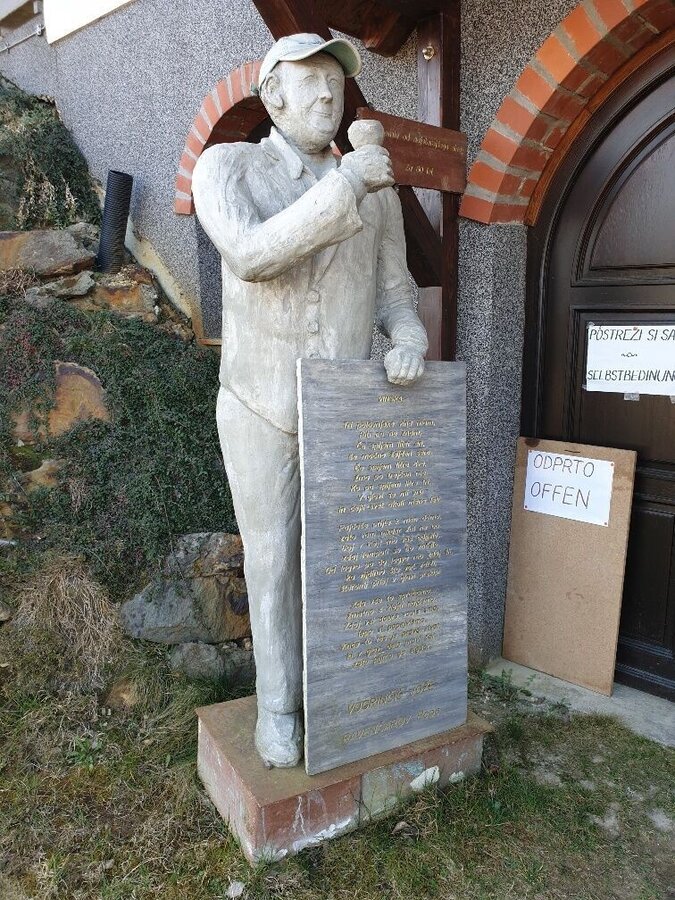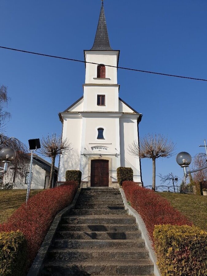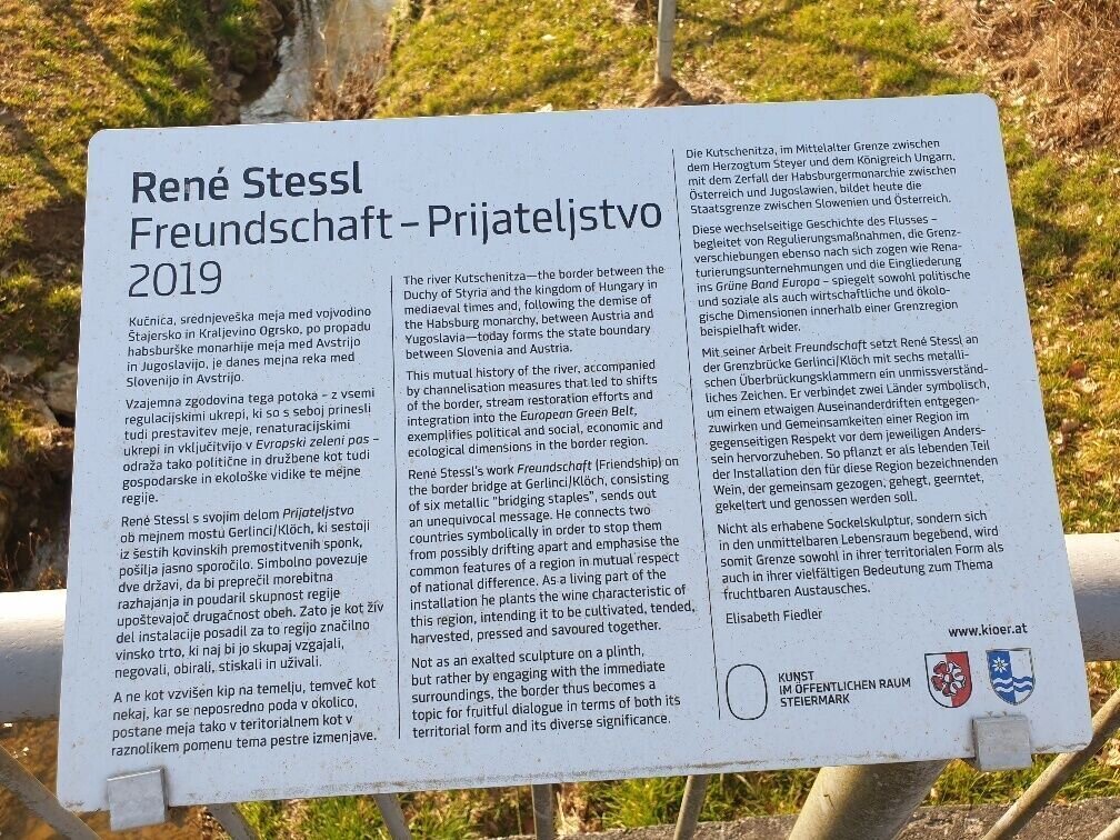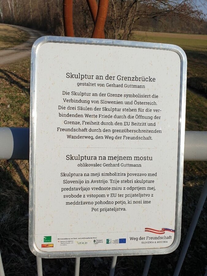There we turn left again along the gravel path to the border crossing in Pölten. There you have the possibility to choose the shortcut path. This leads us further along the border stream, through the village of Gruisla, where we reconnect with the Klöcher Traminerweg. The second variant is the path across the border bridge to Slovenia. In Slovenia, you walk along the main road for a while, then turn half-right into a forest and continue along the road at the end of the forest, then turn left at the crossroads and walk up the hill to Gerlinci. You pass a wine tavern and an inn, continue through the village until you reach the lookout post at the old elementary school. From there you have a wonderful view. There is again the possibility for a shortcut route, which goes along the road for about 400m, then turns left and rejoins the path.