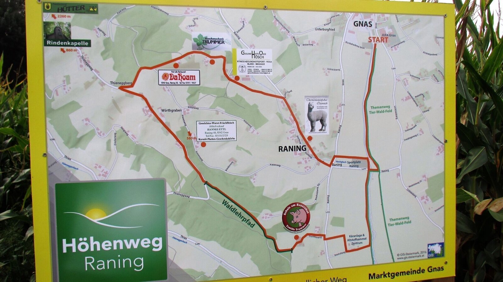 The Höhenwerg of the market community Gnas leads us in the local community Raning mainly through forest and meadow. We start our hike at the sports grounds in Gnas along the Gnasbach stream and on part of the agricultural theme trail. Past the waste collection center, the path leads us to the "School on the Farm", where a stop can be made. Afterwards we can explore most of the local trees at the forest nature trail. From the highest point in the village of Raning we have a wonderful view in all directions. Now we have the possibility to make a stop at the "Dahoam" or Buschenschank Trummer.