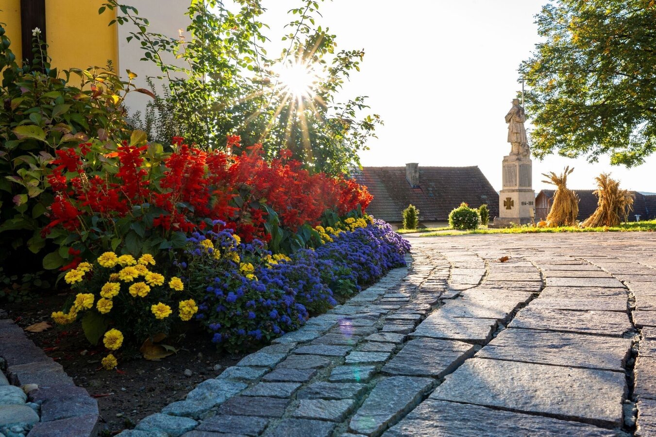 Starting from the guest information Bad Blumau we pass the "Platz der Visionäre" and after about 100 m we turn right and walk over the wooden bridge. Then we turn left into the thermal and spa park Bad Blumau. Along the gravelled path we pass the pigeon coop and the biotope. We will also discover some stations of the nature and culture experience trail "Zukunft spazierendenken". The stone wall gives the thermal park a Mediterranean flair. It is good to rest under the shade of the willow tree. Now the golden dome of the Rogner Bad Blumau already comes into our field of vision. The architecture by Friedensreich Hundertwasser is colorful with golden elements. Along the quietly babbling Safenbach we reach the small village Schwarzmannshofen. Through the forest we come back to the starting point in Bad Blumau.