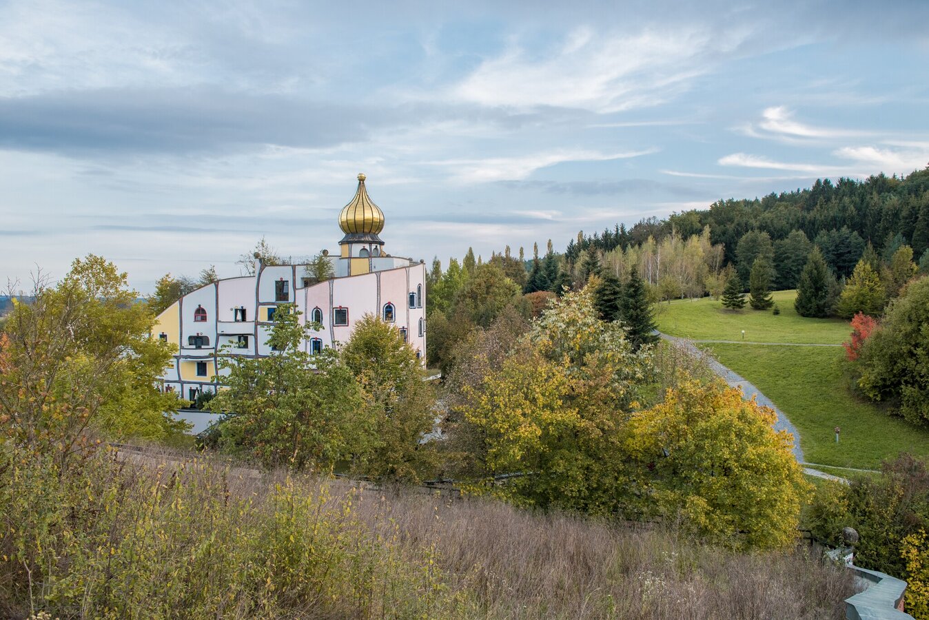 In the center of the village turn left along the Dorfstraße until you reach the Hochwaldweg. Follow this path into the forest. At the first crossing turn left downhill and soon you will see the Hundertwasser architecture again through the trees. A short distance downhill and cross the road and follow the Thermenweg to the right into the village of Bad Blumau. At the parish church of St. Sebastian follow the church path to the starting point in the main street.