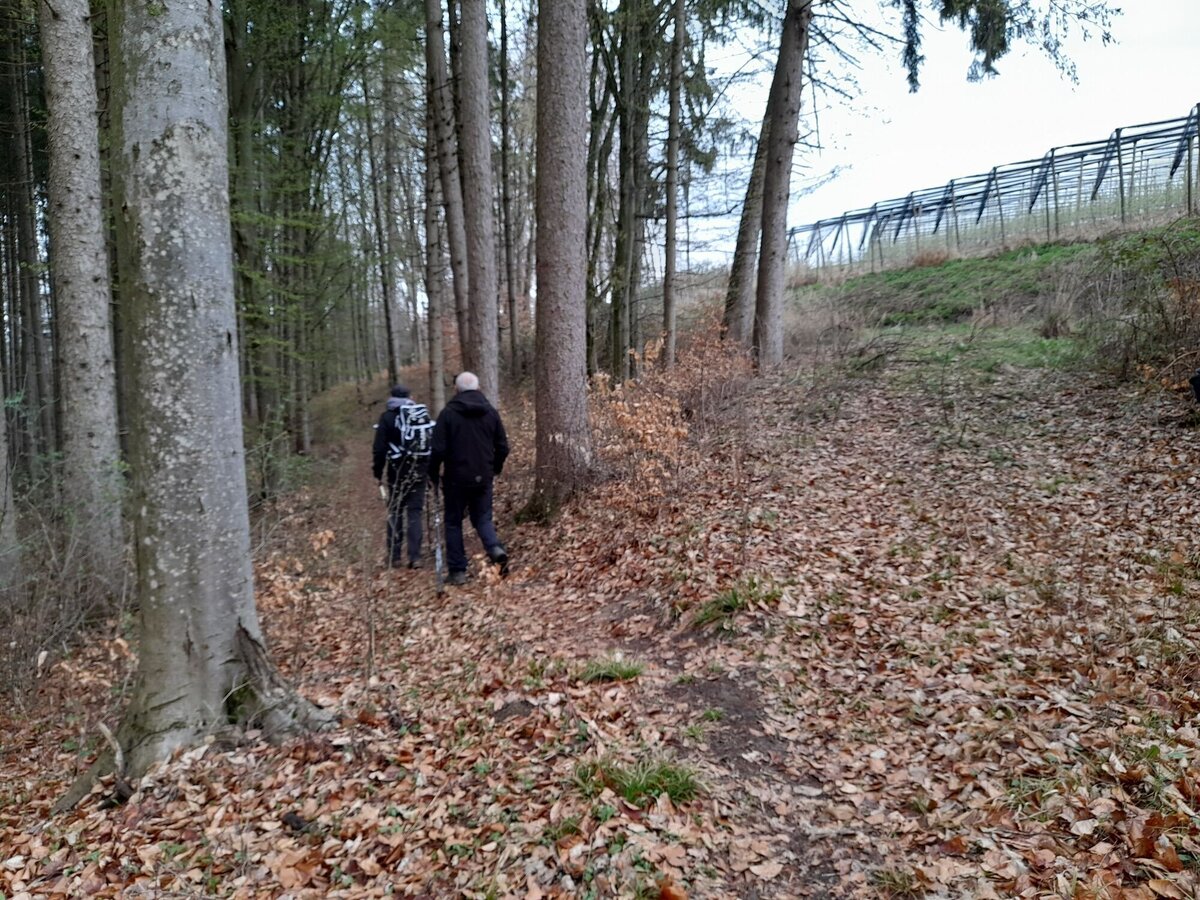 The Tulpenwanderweg continues to the right and after a few meters left into a dead end down the hill. We follow this path down into the valley, passing farms and lush meadows and fertile fields. Once in the valley, the signs direct us to the left on the main road to cross it and follow a house driveway.