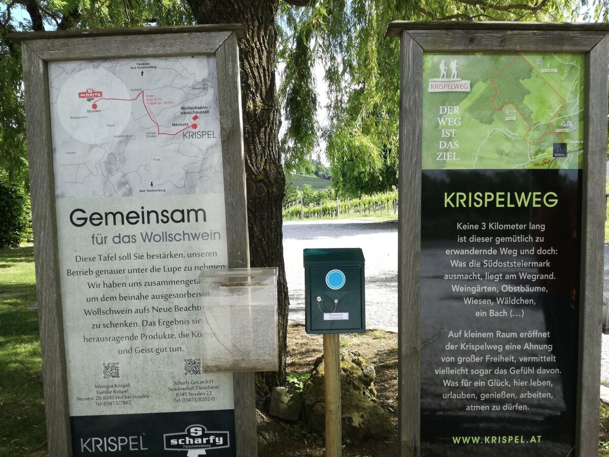 Then we follow the road to the left until we reach the Genussgut Krispel, there we continue along the road from Hof to Frutten. After a refreshment, we follow the road downhill only briefly and immediately turn right onto a side road that leads us over a few bends and a ditch to Ziegel.We now hike along the edge of the forest, and then dive into the forest after all. Thus we come back to the Sulzbach valley on our hike. Across a meadow and over the main road we reach the beautiful farmhouses of Hof bei Straden, and its light column from 1514 at the end of the village, which is a great rarity with its turned base. The small road brings us to Johannisbrunn, where the "Museum Triangle" is located, with the Museum of Medicinal Water and Wedding and the "Museum of Nostalgic Country Life". Here the springs of the valley are most noticeable. But immediately after the bridge, at the unfortunately closed department store, we continue to the left and in the next right turn we take the dirt road straight ahead. We follow it, turn left once again and reach Puxa through meadows and fields. At the sports field we reach our starting point again.