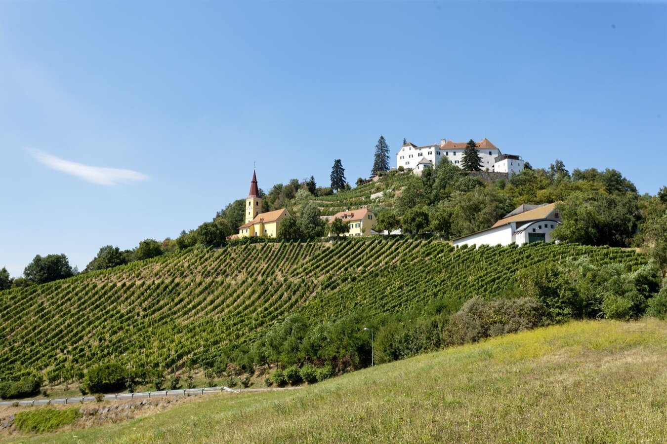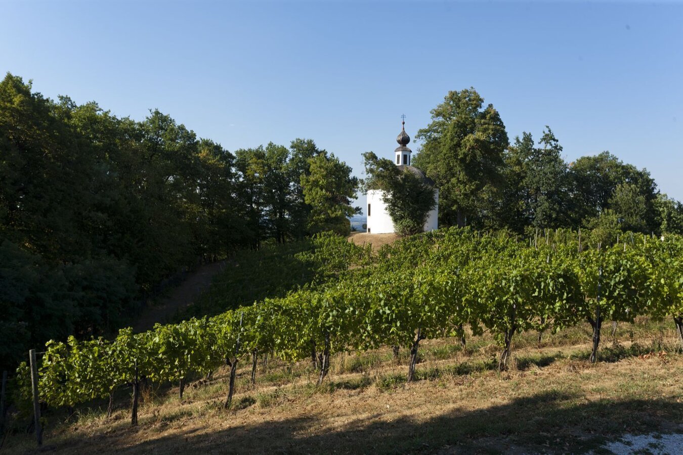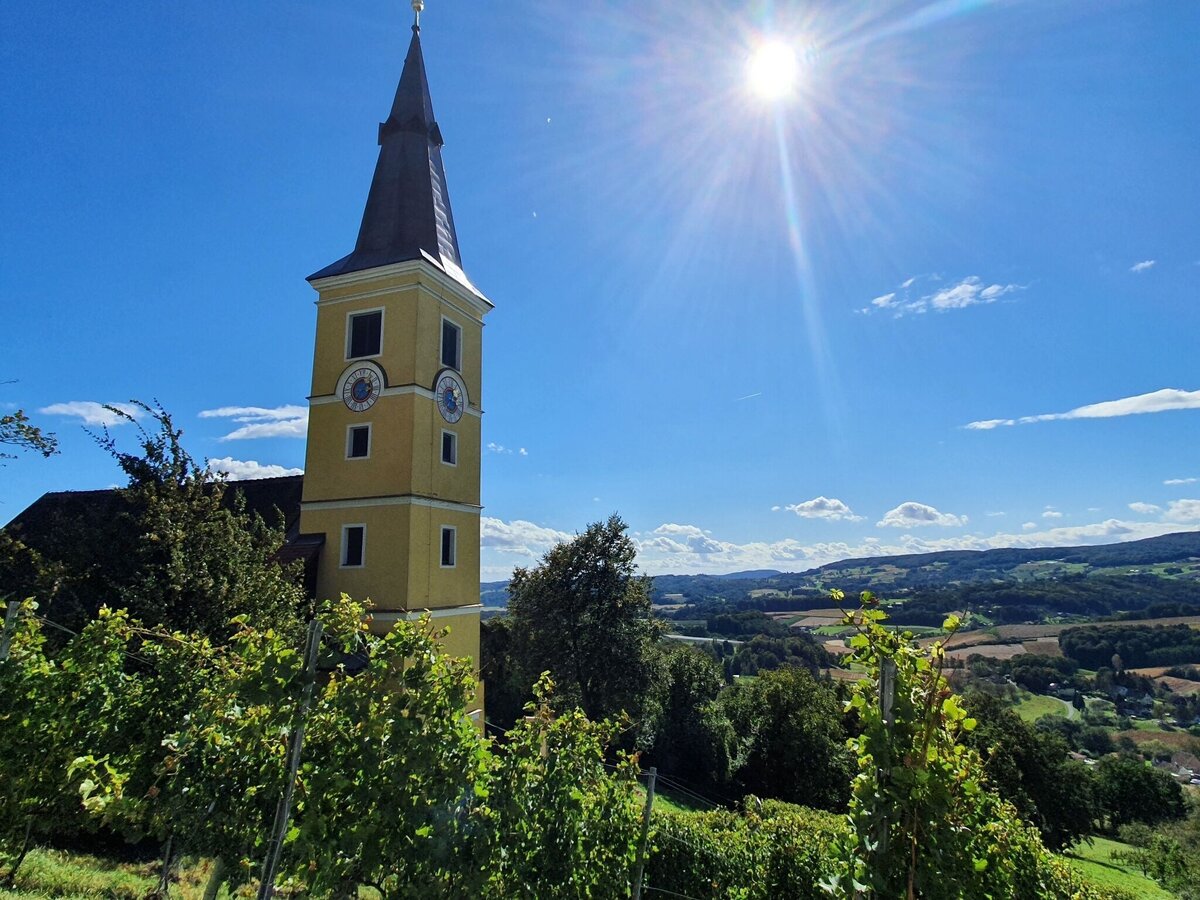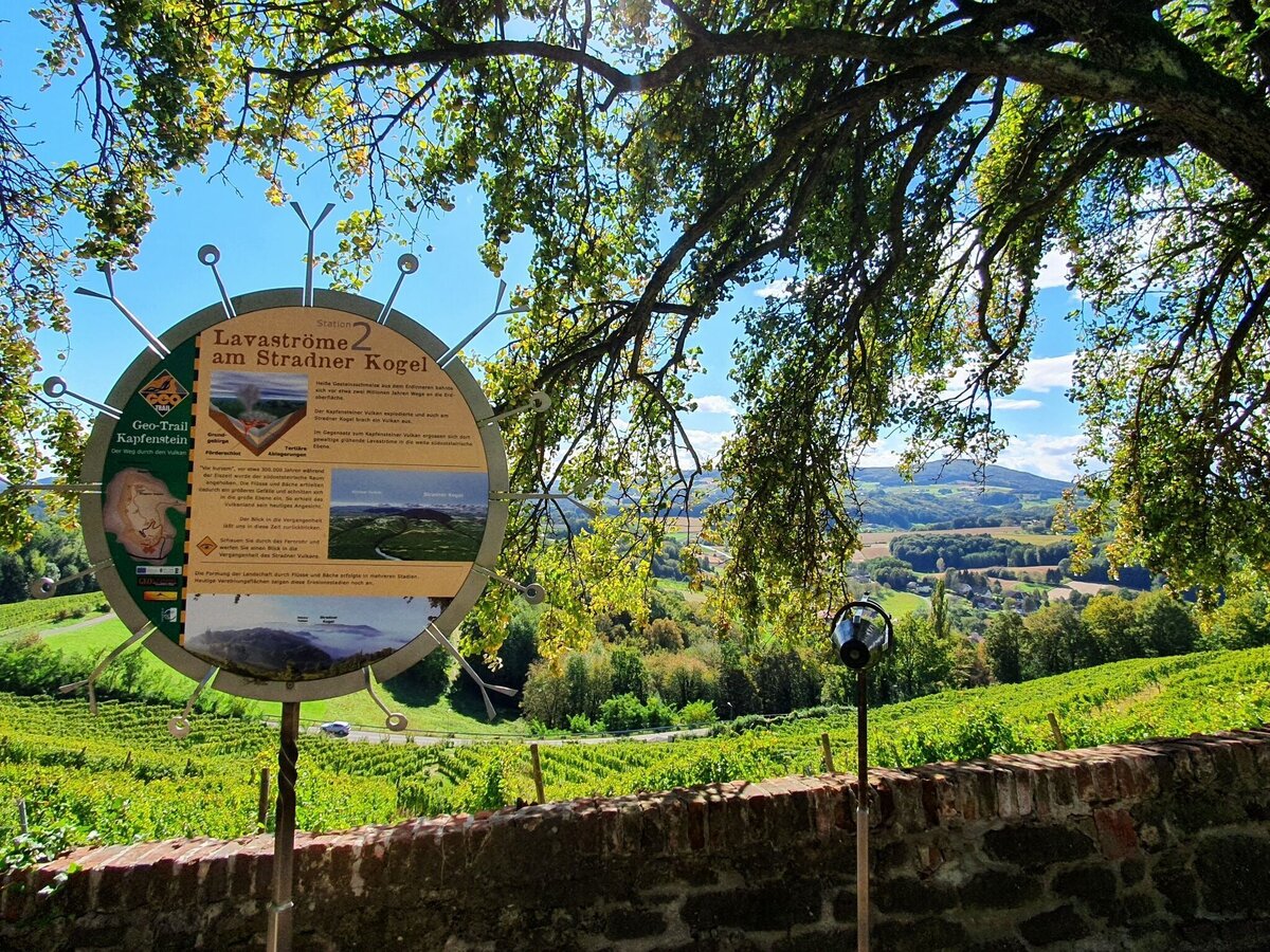 The starting point of the Geo-Trail is at the Winkler-Hermaden winery, from there we walk in the direction of the church, where there is a station where we can look back into the past. Past the church we walk along the volcanic cone into the mixed forest. Here we will find several stations that will give us an understanding of the history of the volcano's origin. After about half the distance you will reach the Sacred Heart Chapel, near it there are more stations and "glimpses into the past". Along the green meadows we hike the volcanic cone and soon reach Kapfenstein Castle and thus also the starting point of the hike.
