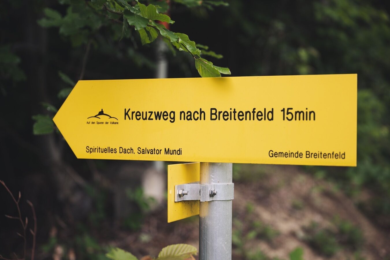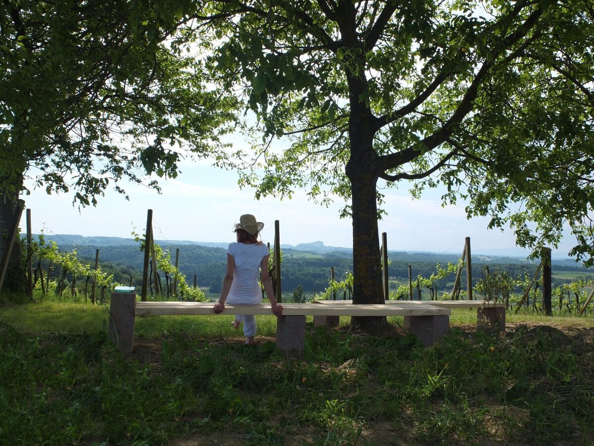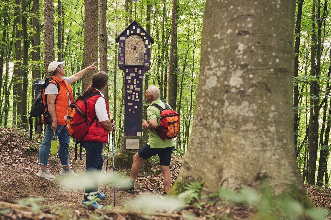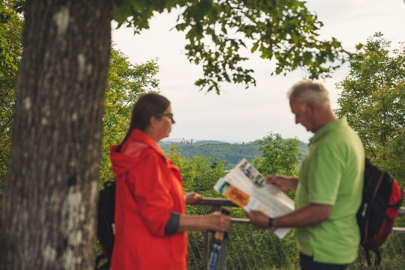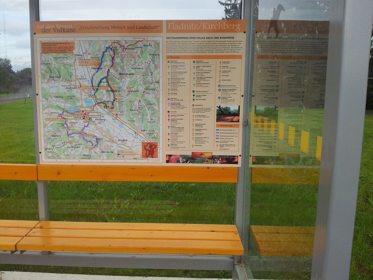 Long-distance hiking route. Spirituelles Dach from Kirchberg an der Raab to Unterlamm.Introduction - guidance for the thoughtful encounter with nature and humankind!The places of spiritual contemplation include 7 stops along the Spirituelles Dach on the Trails of the Volcanoes. These points of reflection are located in the municipalities of Kirchberg, Fladnitz, Eichkögl, Markt Hartmannsdorf, Breitenfeld, Hatzendorf and Unterlamm. Selected through reflecting spatial perception and the relationship of the places with each other, these places are characterized by their vitality and beautiful landscape. With its gently curved forms, the meadows, fields, forests as well as the churches and residential areas, the diversity of Vulkanland’s cultural landscape becomes visible. The places are inviting to take a rest. Through their atmosphere they facilitate a contemplative halt, deepening the emotional relationship between individuals and the landscape. Spiritual walking focuses entirely on the contemplative encounter with nature and allows us to have a more conscious and emotional experience. Meditative writings by Christian mystics support us in our awareness and, together with the respective places, promote a deeper understanding of the landscape as well as an intimate look into ourselves. The following text is intended as a guide and can be adapted according to personal preference.Arriving at a stop, we find ourselves a comfortable seat and let our gaze wander aimlessly into the landscape to enjoy its rhythms, shapes and colors. We want to feel the spirit of our surroundings and the invisible life and forces of the place - closing our eyes is helpful for this. We focus on our inner self and breath consciously, inhaling deeply into the center of our body and exhaling back into space, paying attention to our connection with the ground we sit on. The next step is to focus our mindfulness on the heart. With each heartbeat we strengthen the emotional bond with Earth and all its living beings. This way we can send an impulse (a color, a feeling, an intrinsic greeting) from the heart into the landscape and build a contemplative-spiritual feeling within us. If we want to increase our awareness for encounters with the landscape, we focus inwards and pay attention to physical, emotional, or mental reactions without evaluating them. We put our experiences down on paper or share them within the group. This way we collect more and more landscape experiences and become able to recognize the effect of different spatial qualities on ourselves. Through these conscious rituals we strengthen the heartfelt connection with our surroundings and deepen the personal spatial perception of the visible as well as the invisible qualities of the landscape. At the same time, we experience our own personality on a physical, emotional and spiritual level.For the Spiritual Roof an informational brochure is available (German only).