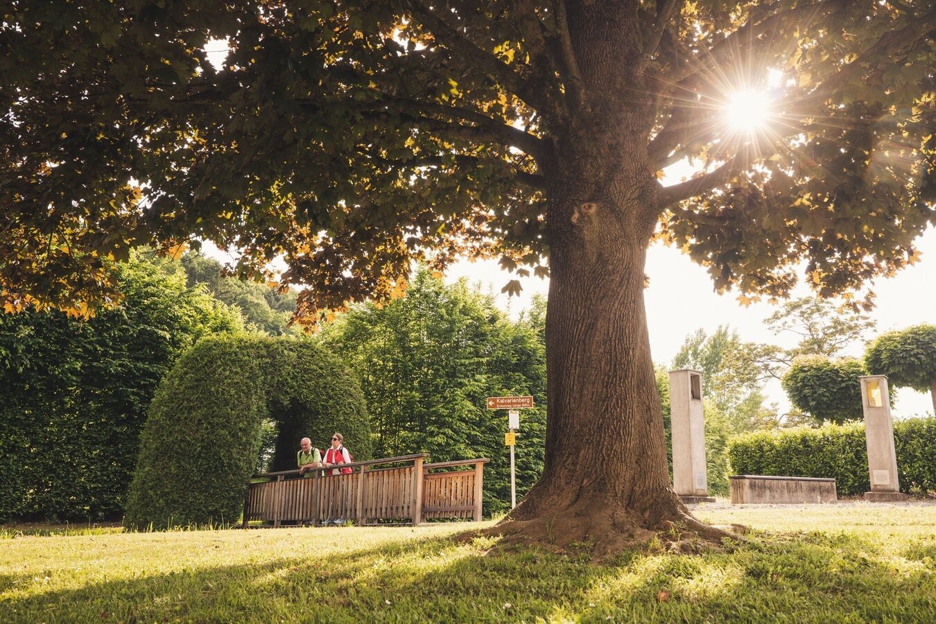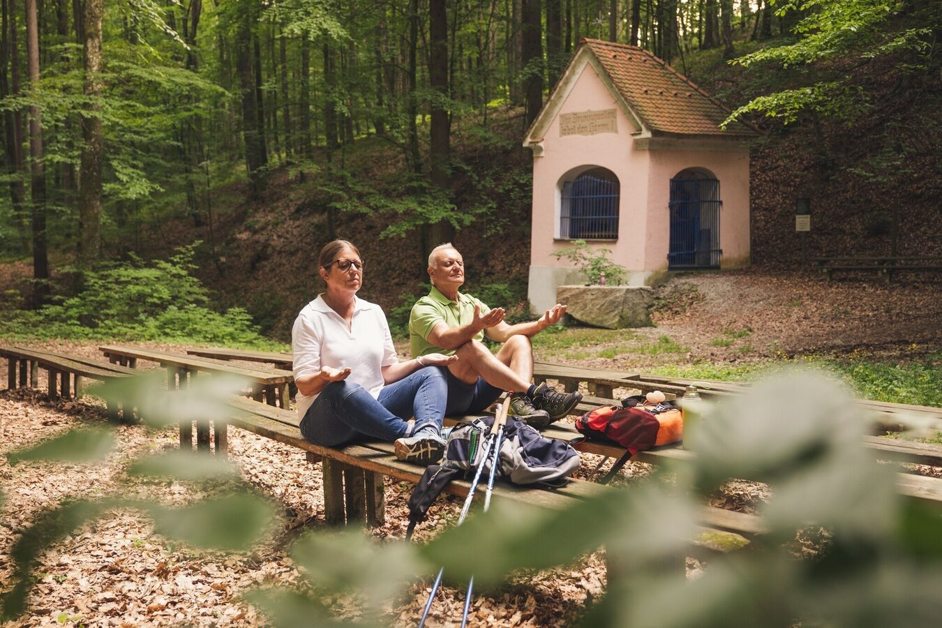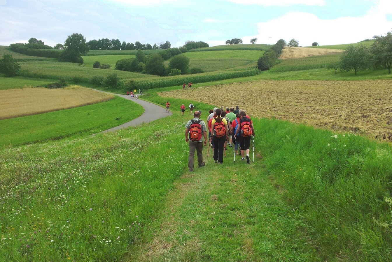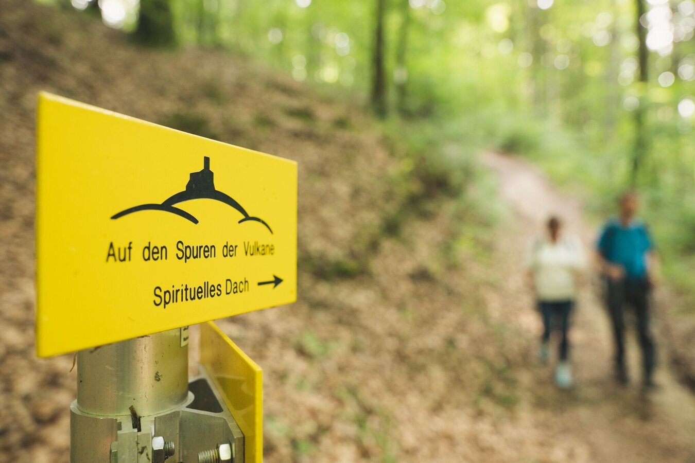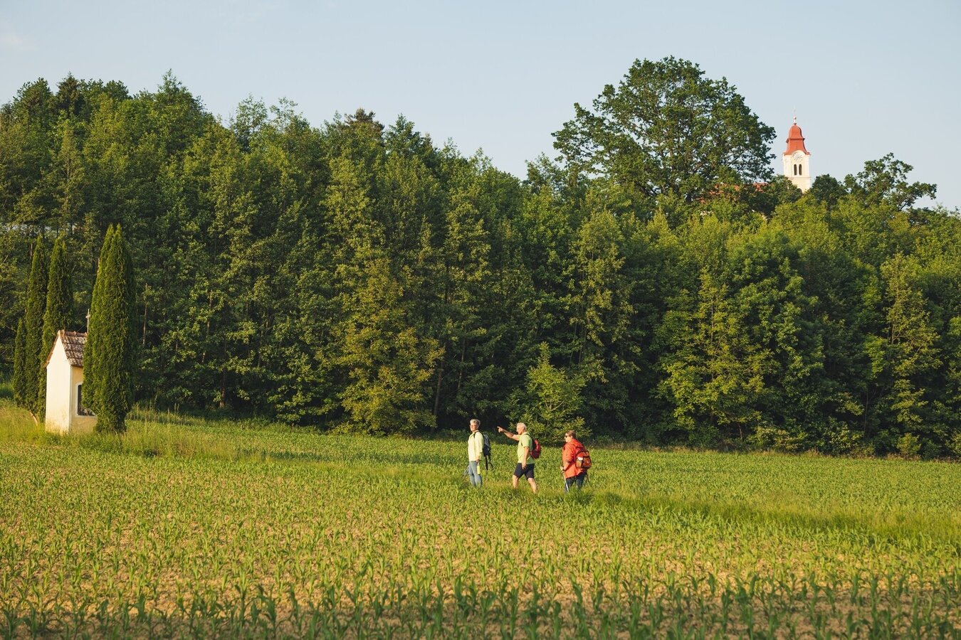 Long-distance hiking route. Spirituelles Dach from Kirchberg an der Raab to Unterlamm.Introduction - guidance for the thoughtful encounter with nature and humankind!The places of spiritual contemplation include 7 stops along the Spirituelles Dach on the Trails of the Volcanoes. These points of reflection are located in the municipalities of Kirchberg, Fladnitz, Eichkögl, Markt Hartmannsdorf, Breitenfeld, Hatzendorf and Unterlamm. Selected through reflecting spatial perception and the relationship of the places with each other, these places are characterized by their vitality and beautiful landscape. With its gently curved forms, the meadows, fields, forests as well as the churches and residential areas, the diversity of Vulkanland’s cultural landscape becomes visible. The places are inviting to take a rest. Through their atmosphere they facilitate a contemplative halt, deepening the emotional relationship between individuals and the landscape. Spiritual walking focuses entirely on the contemplative encounter with nature and allows us to have a more conscious and emotional experience. Meditative writings by Christian mystics support us in our awareness and, together with the respective places, promote a deeper understanding of the landscape as well as an intimate look into ourselves. The following text is intended as a guide and can be adapted according to personal preference.Arriving at a stop, we find ourselves a comfortable seat and let our gaze wander aimlessly into the landscape to enjoy its rhythms, shapes and colors. We want to feel the spirit of our surroundings and the invisible life and forces of the place - closing our eyes is helpful for this. We focus on our inner self and breath consciously, inhaling deeply into the center of our body and exhaling back into space, paying attention to our connection with the ground we sit on. The next step is to focus our mindfulness on the heart. With each heartbeat we strengthen the emotional bond with Earth and all its living beings. This way we can send an impulse (a color, a feeling, an intrinsic greeting) from the heart into the landscape and build a contemplative-spiritual feeling within us. If we want to increase our awareness for encounters with the landscape, we focus inwards and pay attention to physical, emotional, or mental reactions without evaluating them. We put our experiences down on paper or share them within the group. This way we collect more and more landscape experiences and become able to recognize the effect of different spatial qualities on ourselves. Through these conscious rituals we strengthen the heartfelt connection with our surroundings and deepen the personal spatial perception of the visible as well as the invisible qualities of the landscape. At the same time, we experience our own personality on a physical, emotional and spiritual level.For the Spiritual Roof an informational brochure is available (German only).