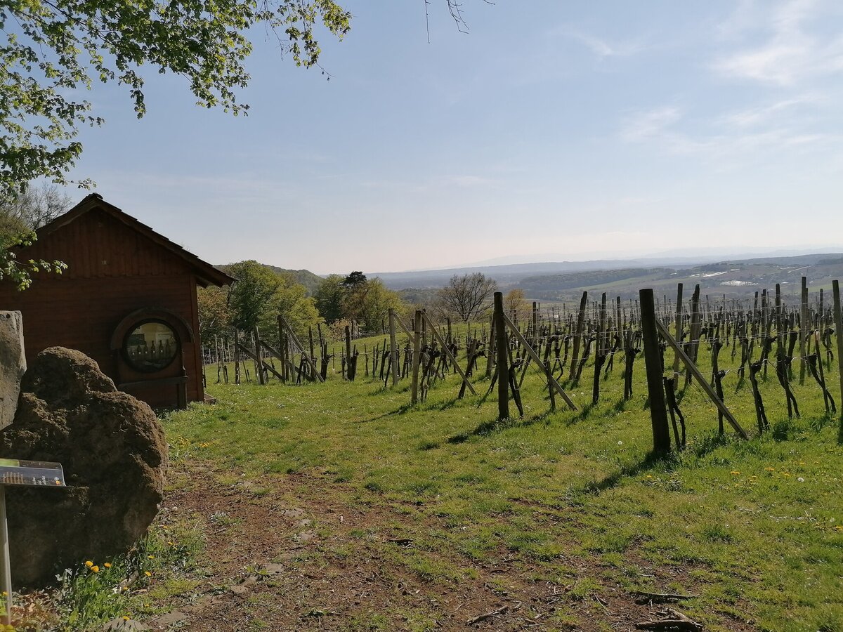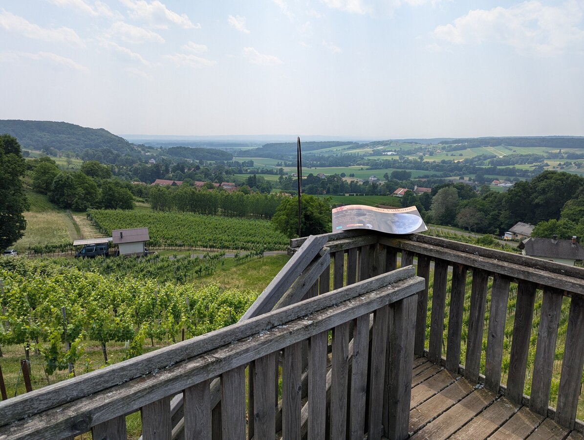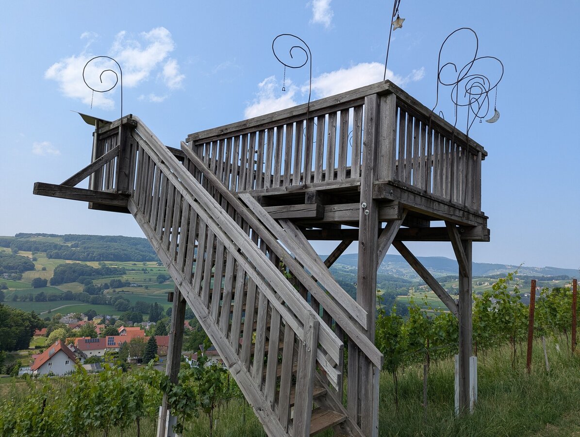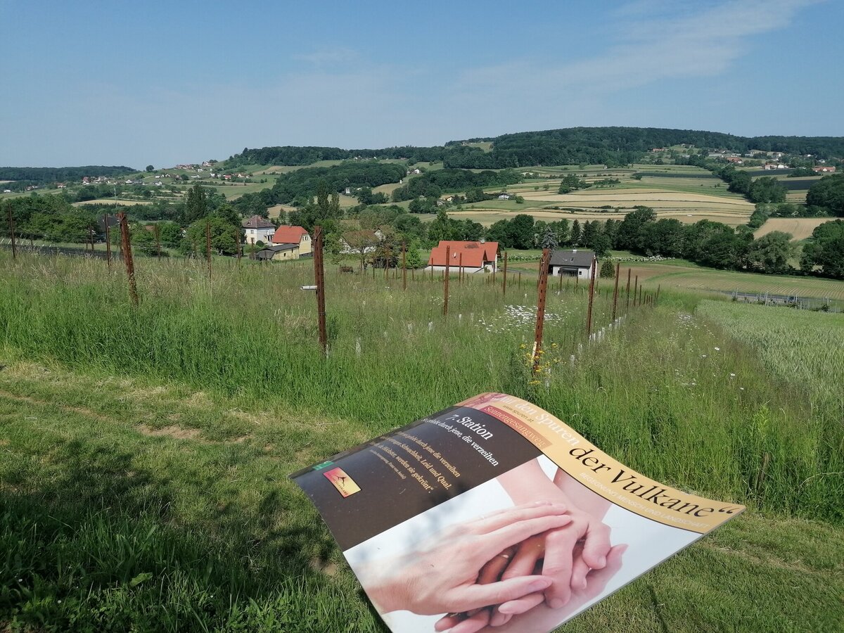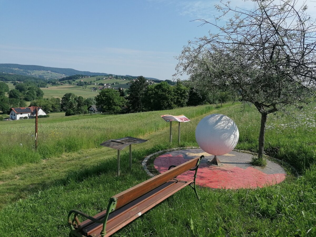 The trail starts at the market square and passes by the sundial, from where it goes in the direction of the basalt fissure. At the beginning there are 80 meters of ascent. Up the road, then along the small wood out of the village into the vineyard we come to the forest, where the access to "Moon & Stars" is located. On a small viewing platform you have a magnificent view over Tieschen to the Bacherngebirge. Follow the path back to the junction and then turn left to reach the junction to the Windharfe. Follow the edge of the forest for a while and then enter the open forest to the basalt crevice. Passing underneath it, we reach a forest road on the level forest path, under which the Elisabeth spring bubbles out of the basalt stone a little further to the right. From here we go down to the forest path below, which leads us out of the forest on the left again, straight to the "fire" burning in a meadow orchard next to the path. As soon as we reach a farm, we branch off to the left and come to the labyrinth on the right in the forest, which leads us to the earth. Then on the path briefly down to the right towards Pichla (where there is the possibility to visit the chapel in Pichla about 150 m to the right), then left along the road slightly uphill and soon right again on a dirt road is finally peace and reconciliation themed. A little further ahead on the road then right and once again right straight down into the village and left back to the church we come to the eighth and last station next to the church: death, which is represented as the gateway to life.