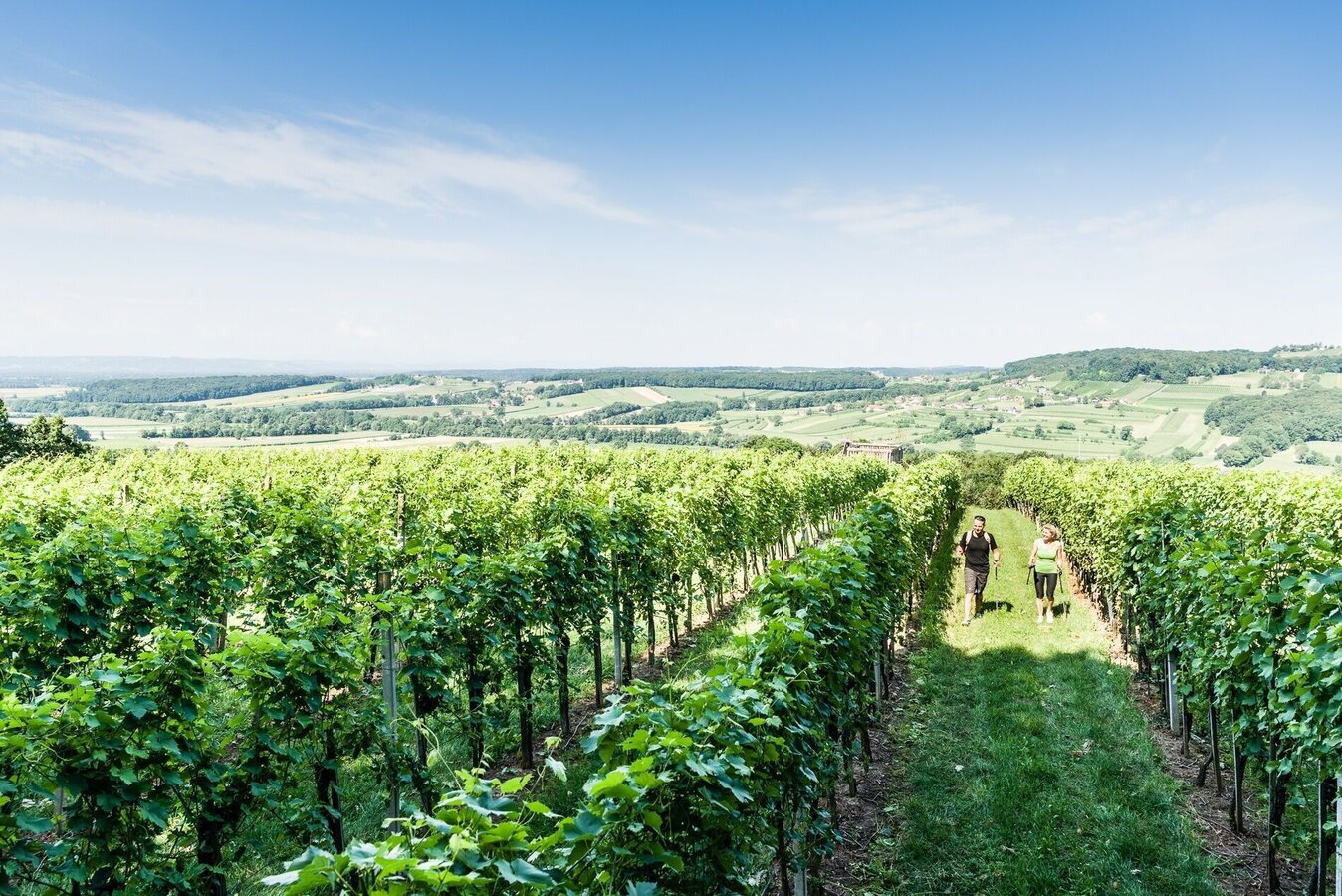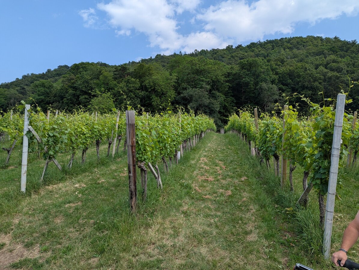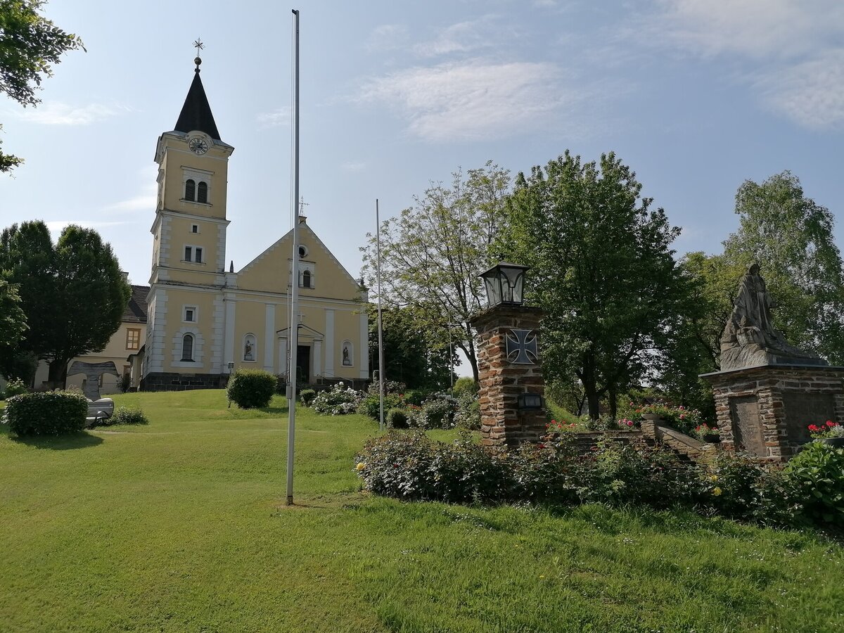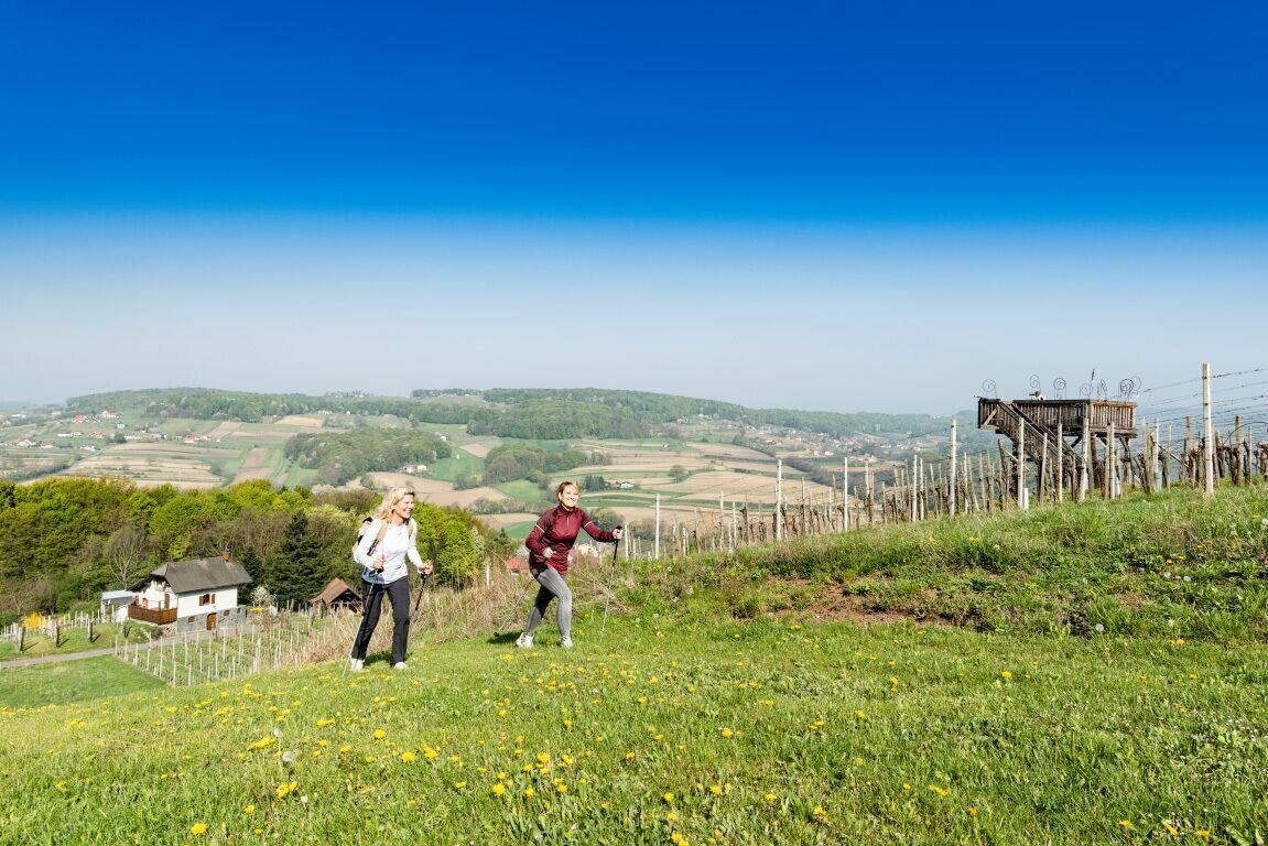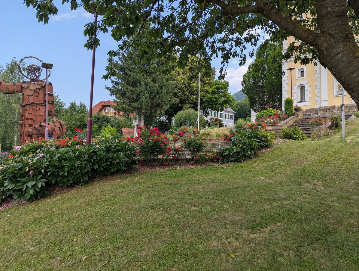 The trail starts at the market square and passes by the sundial, from where it goes in the direction of the basalt fissure. At the beginning there are 80 meters of ascent. Up the road, then along the small wood out of the village into the vineyard we come to the forest, where the access to "Moon & Stars" is located. On a small viewing platform you have a magnificent view over Tieschen to the Bacherngebirge. Follow the path back to the junction and then turn left to reach the junction to the Windharfe. Follow the edge of the forest for a while and then enter the open forest to the basalt crevice. Passing underneath it, we reach a forest road on the level forest path, under which the Elisabeth spring bubbles out of the basalt stone a little further to the right. From here we go down to the forest path below, which leads us out of the forest on the left again, straight to the "fire" burning in a meadow orchard next to the path. As soon as we reach a farm, we branch off to the left and come to the labyrinth on the right in the forest, which leads us to the earth. Then on the path briefly down to the right towards Pichla (where there is the possibility to visit the chapel in Pichla about 150 m to the right), then left along the road slightly uphill and soon right again on a dirt road is finally peace and reconciliation themed. A little further ahead on the road then right and once again right straight down into the village and left back to the church we come to the eighth and last station next to the church: death, which is represented as the gateway to life.